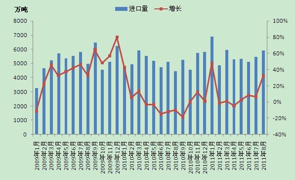 8月份进口铁矿石5909万吨,比上个月增加454万吨,同比增长32.5%。1-8月累计进口44757万吨,同比增长10.6%。
