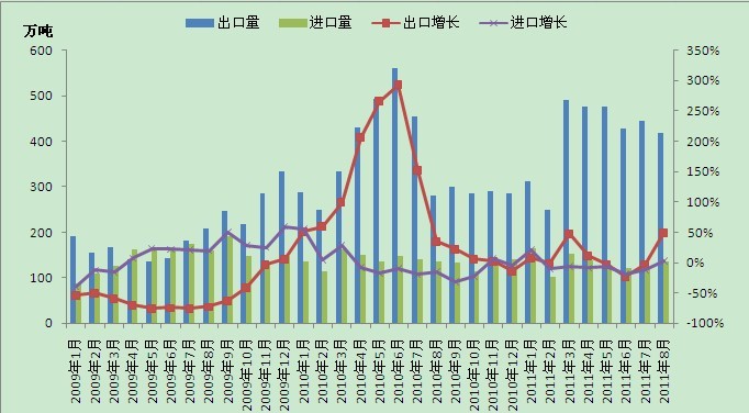 据海关最新统计,8月份我国钢材出口小幅回落,但仍在400万吨以上,进口小幅增加。铁矿石进口增加明显。